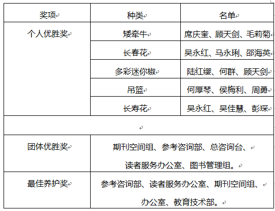 近日,历时三个月的图书馆第五届“养花种绿”环境美化大赛成绩揭晓,五种植物种植的个人优胜奖、团体优胜奖及最佳养护奖同时出炉。