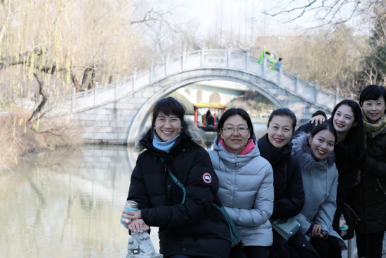 “瘦湖心仪久,有幸赴扬州。神恋莲桥秀,魂迷花画舫幽”。虽然已至深冬,瘦西湖依然美不胜收,五步一景,十步一画,名寺古刹和古城墙垣绵延相属,名胜古迹和历史遗存散布其间,风韵独具的自然风光和含蕴丰厚的人文景观相映生辉,是镶嵌在历史文化名城中的一颗璀璨明珠。置身于如此美景,老师们顿觉卸去一年的辛劳疲惫,身心舒畅,让人流连忘返,不忍离去。