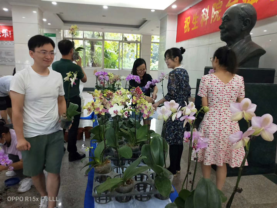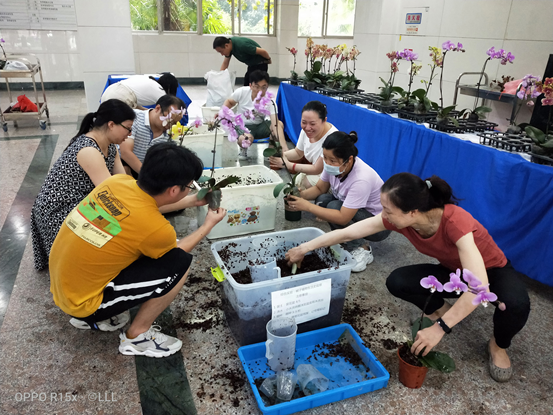 活动现场生科院工会工作人员精心布置了一百多盆蝴蝶兰,花色多彩,有纯白、鹅黄、淡紫、浅粉、绯红,还有带着脉纹、镶着花边的,像一只只美丽的蝴蝶,张着翅膀,伸着头颈,在枝头蹁跹。工作人员还准备了大量蝴蝶兰栽培基质,并为现场选花的老师提供养护知识介绍。