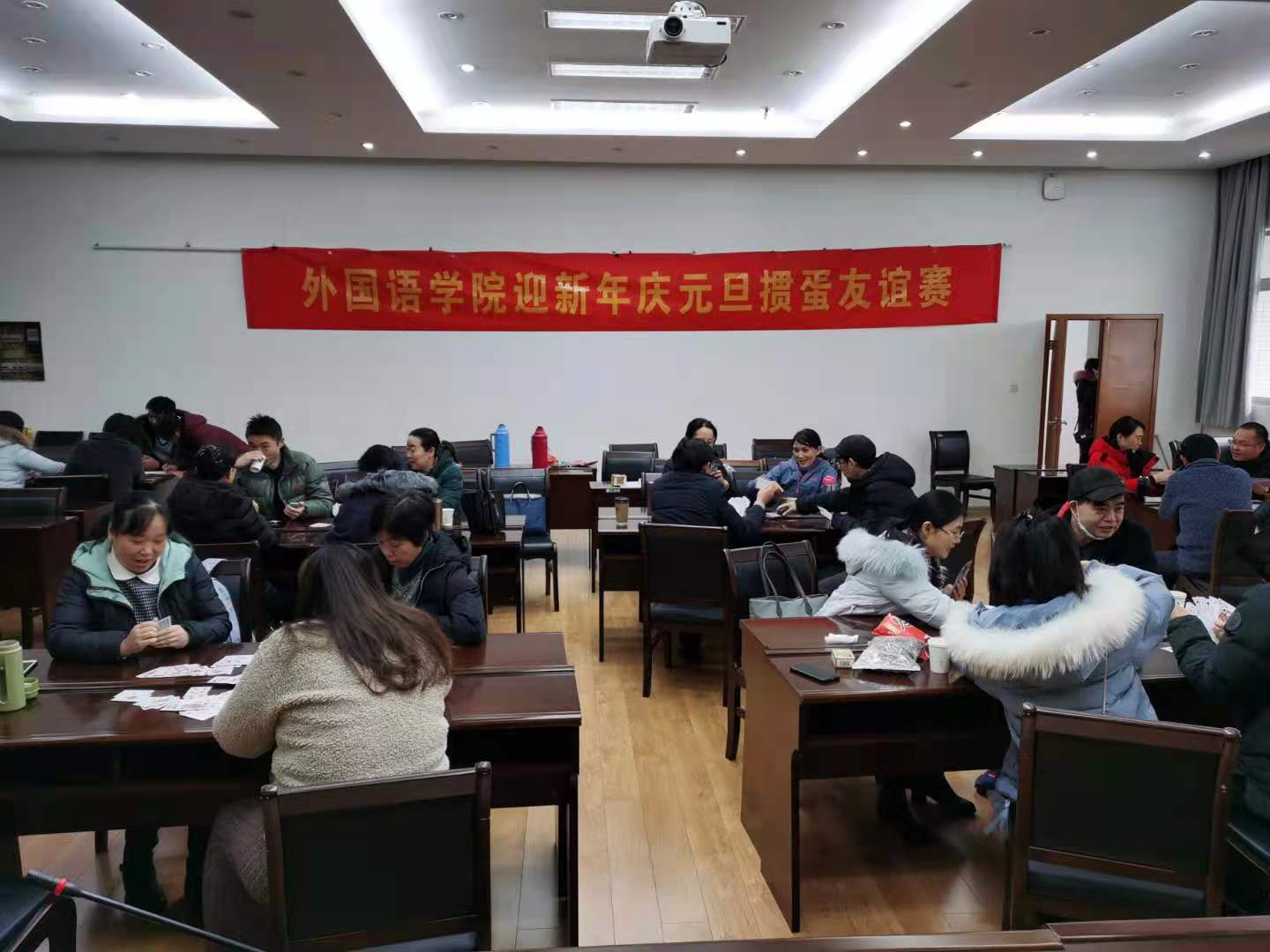 2020即将过去,这是一个不平凡的一年,在新的一年来临之际,外国语学院工会以举办迎新年庆元旦全院掼蛋比赛的方式来迎接新的一年。工会委员认真组织,精心布置,努力营造新年的氛围,让大家感受外院工会组织的温馨和温暖。比赛于2020年12月18日下午2点在教学楼7楼报告厅举行,共有29名教工参加此次活动,活动在大家的欢声笑语中拉开帷幕。