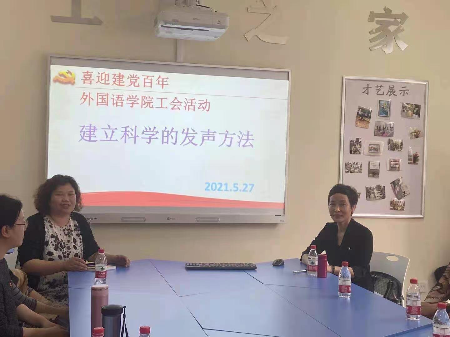 2021年5月27日下午,外国语学院工会在教学楼A322工会之家开展了一次“建立科学的发音”培训活动。我院教师和研究生参加了此次活动,该活动由工会主席王凤英主持。