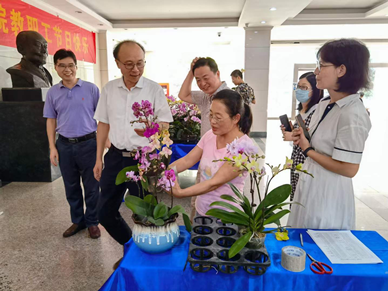 在活动现在,学院的老师们在一片欢声笑语中,欣赏、挑选自己喜爱的蝴蝶兰花,并不时的用手机拍照、发朋友圈。植物生物系宋小玲教授还给老师们现场演示了蝴蝶兰如何盆栽养护,还吸引了学校和学院领导的围观,整个活动现场洋溢着欢快、喜庆的节日氛围。