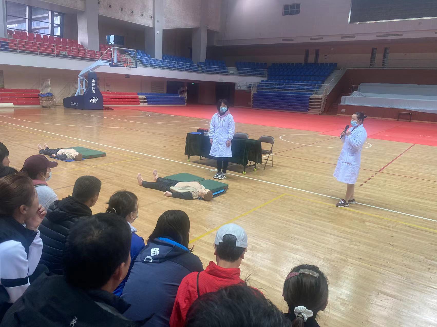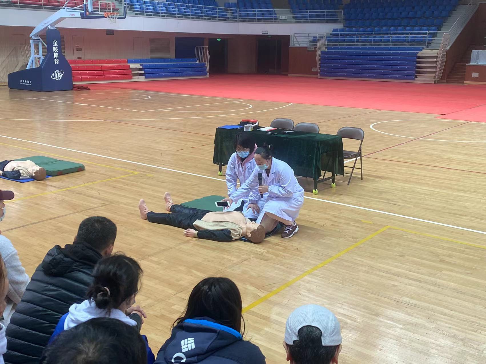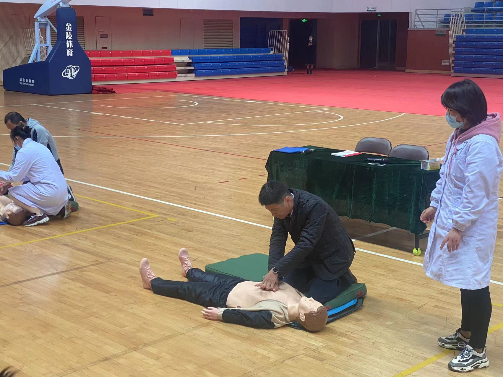 医生讲解完毕,所有体育部教职员工在医生的指导下进行实践体验。