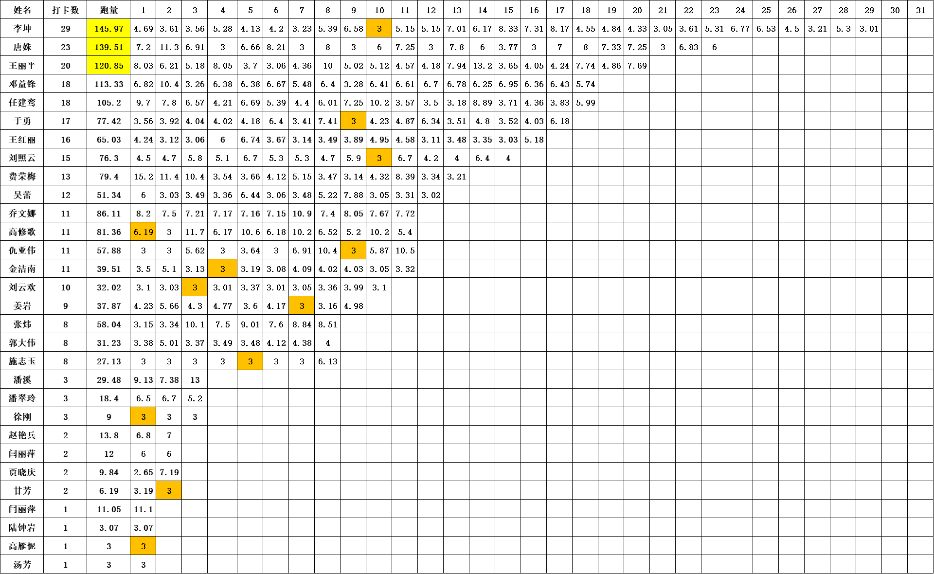 本次跑团比赛活动,共有30位老师参与打卡,15为老师完成打卡任务,跑量最高的三位老师分别为李坤(145.97km)、唐姝(139.51km)、王丽平(120.85km)。