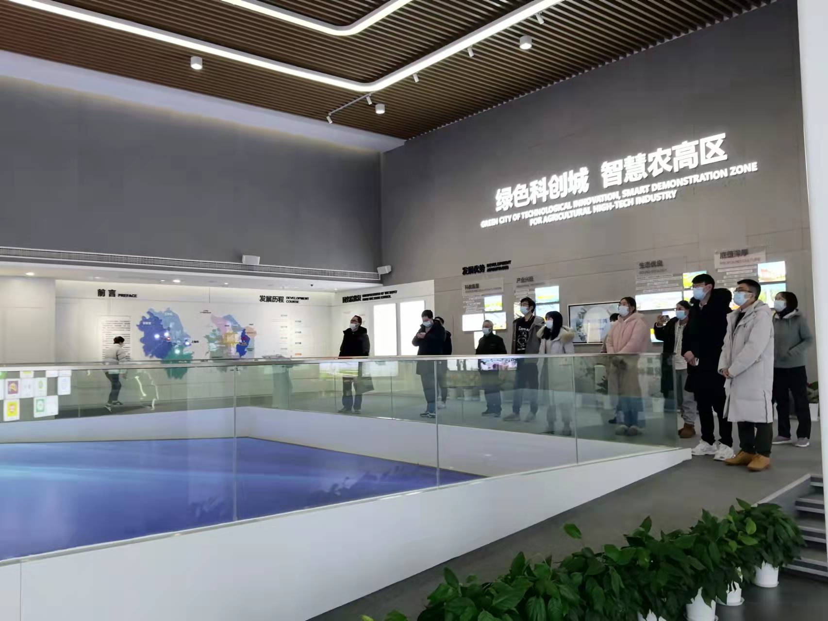 南京国家农业高新技术产业示范区位于江苏省南京市溧水区白马镇,是中国首批、长三角地区唯一的国家农高区,主要由科技创新核心区、农业高新技术产业区和辐射带动区三部分组成。其前身是创立于2009年的江苏南京白马国家农业科技园区,2010年被科技部批准为国家农业科技园区,2016年获批江苏省南京白马高新技术产业开发区。2019年国务院发文同意将南京白马国家农业科技园区建设为南京国家农业高新技术产业示范区。跟随讲解员的步伐,教职工详细了解南京农高区的发展历史、发展规划、创新平台建设、主导产业、人才队伍及园区管理运营模式等情况。