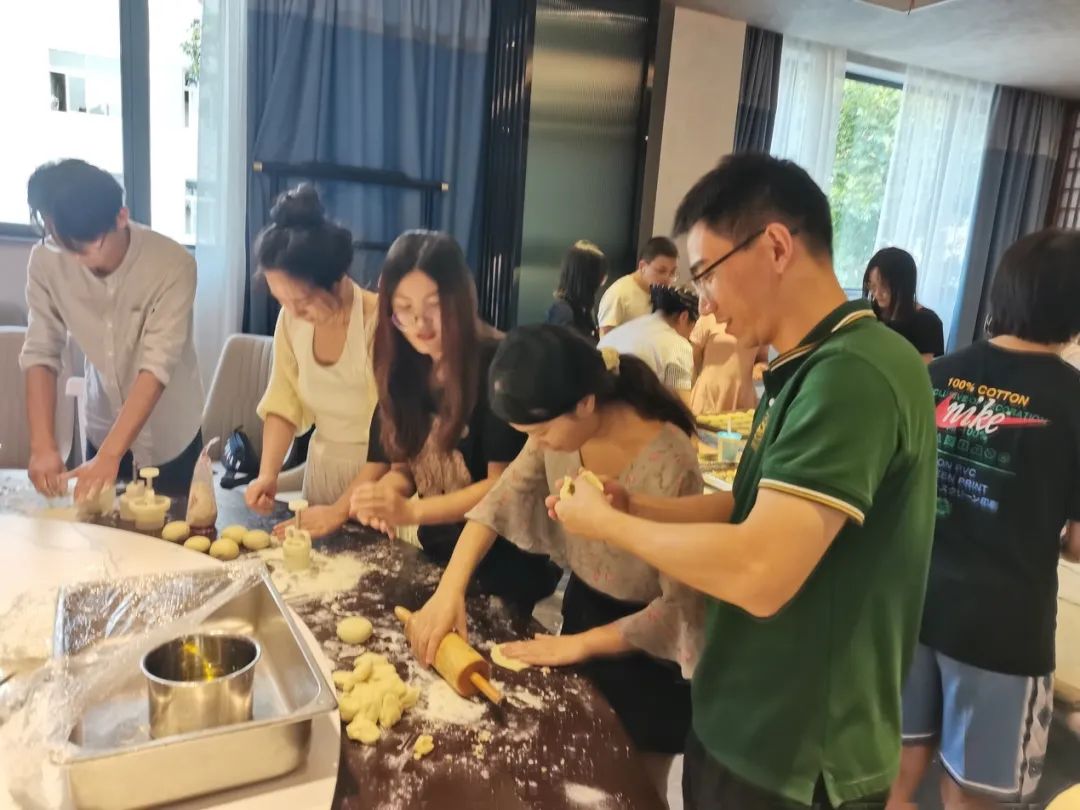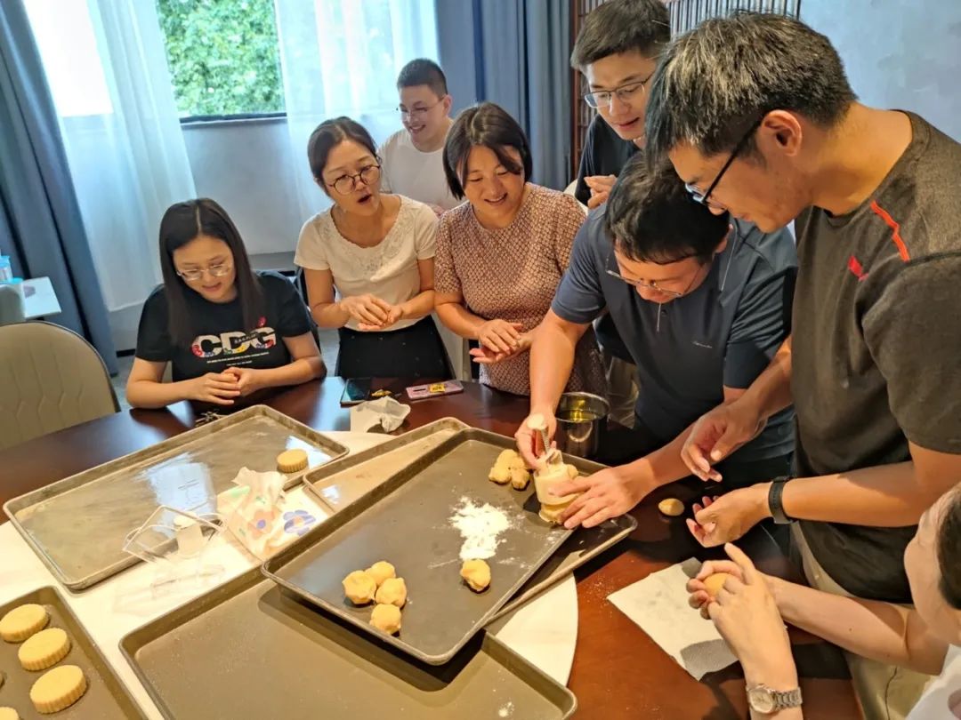 活动伊始,主持人向在场师生介绍了教师节的由来和中秋节的传统文化习俗。紧接着,烘焙师傅手把手地指导师生们做广式月饼和苏式月饼,大家都聚精会神地跟着师傅学。师生们有的擀皮包馅,有的压模打饼、有的包装月饼,大家互相切磋制作月饼的经验现场洋溢着浓浓的节日气氛。师生们拿出做科研的认真劲儿,很快掌握了做月饼的诀窍,做出的月饼很有卖相。不一会儿,桌上摆满了师生们的劳动成果,有的月饼带有学校120周年校庆的logo,有的月饼带有学校的校徽,还有的是精美的花纹。月饼经过高温烘烤后,满屋都散发出浓浓香味。