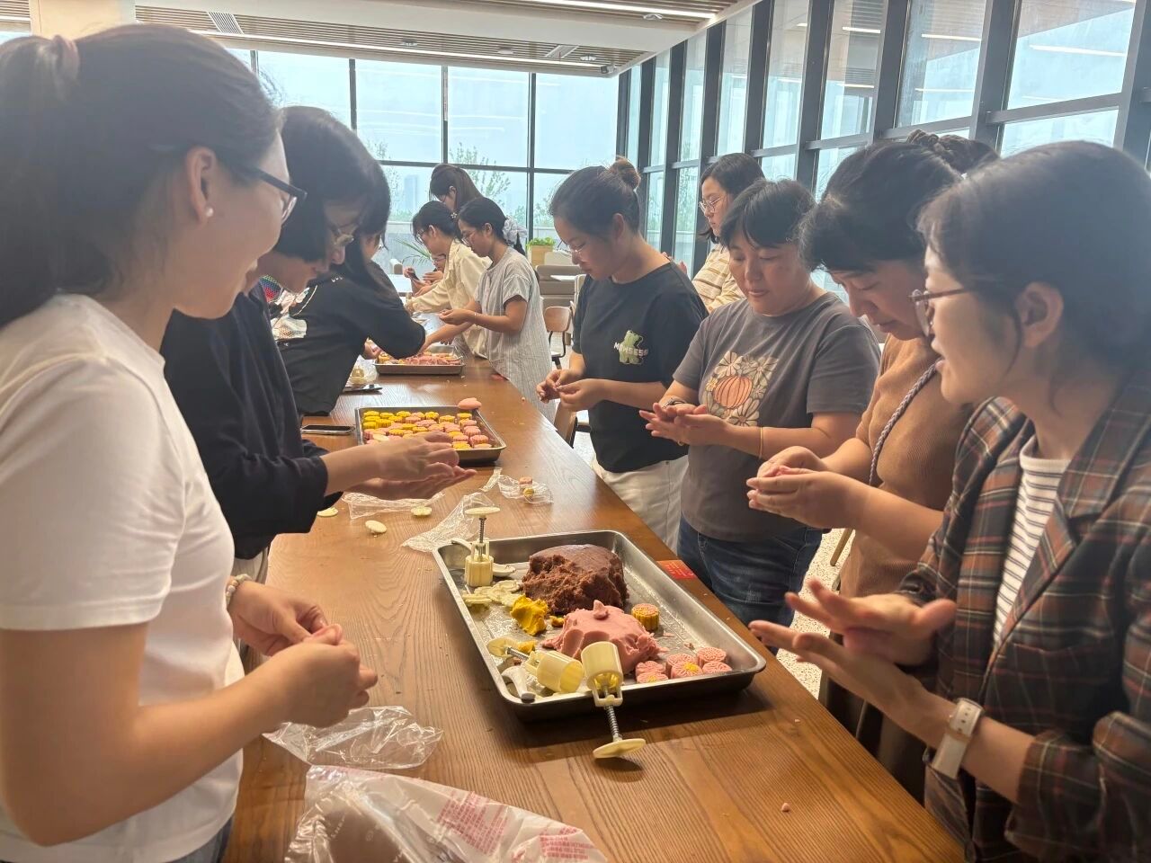随后,是月饼制作环节,大家将一个个面皮在手心轻压成薄片,放入不同口味的馅料,并慢慢收口。经过模具的按压,一个精美的月饼便呈现出来。大家热情洋溢,说笑间,既能够制作标致的月饼,也能实践自己的月饼创意。最后在大家的共同努力下共制作了将近300个月饼,为中秋佳节添上一笔圆满的回忆。