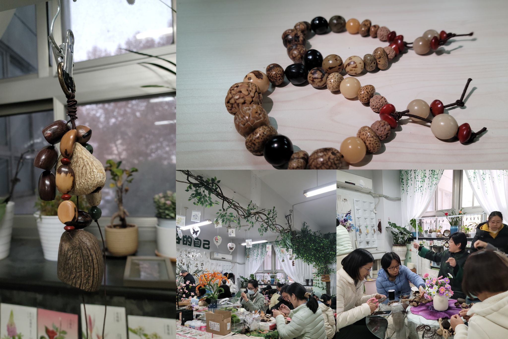 教工之家内布置一新,长桌上并列摆放着各类材料。教师们一进门,便被琳琅满目的果实所吸引:大号的水铃桐、中号的夹竹桃果与鸭腱藤果、小号的无患子与南酸枣核,以及各色散珠,在托盘间散发着温润光泽;果实相互敲击间发出哗啦啦的悦耳声响。皮绳、麻绳与弹力绳交错摆放,引得老师们兴致盎然。